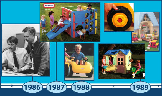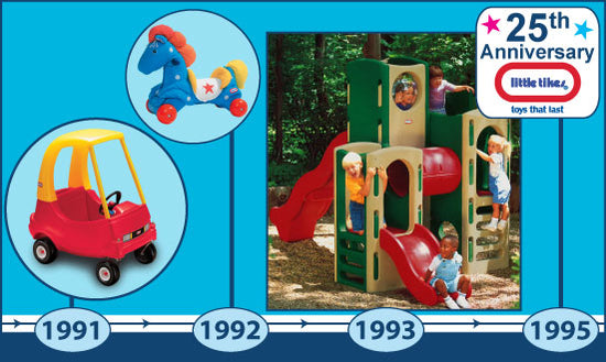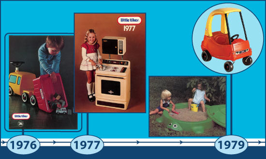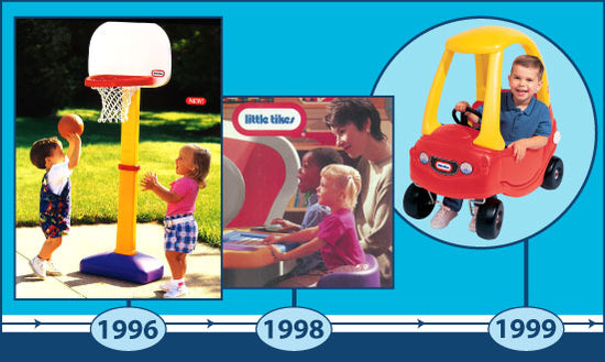 Introduced the 1st handheld plastic truck line with plastic molding, soft rubber tires, easy operation, and free moving parts, all built with Little Tikes™ superior quality. Country Cottage reinvents how we play outdoors once again with its realistic design of modern homes in America. Fall of 1989 Little Tikes™ introduces 1st Plastic Doll House with miniatures of our most popular toys including a Cozy Coupe® Car, Turtle Sandbox, and Party Kitchen.